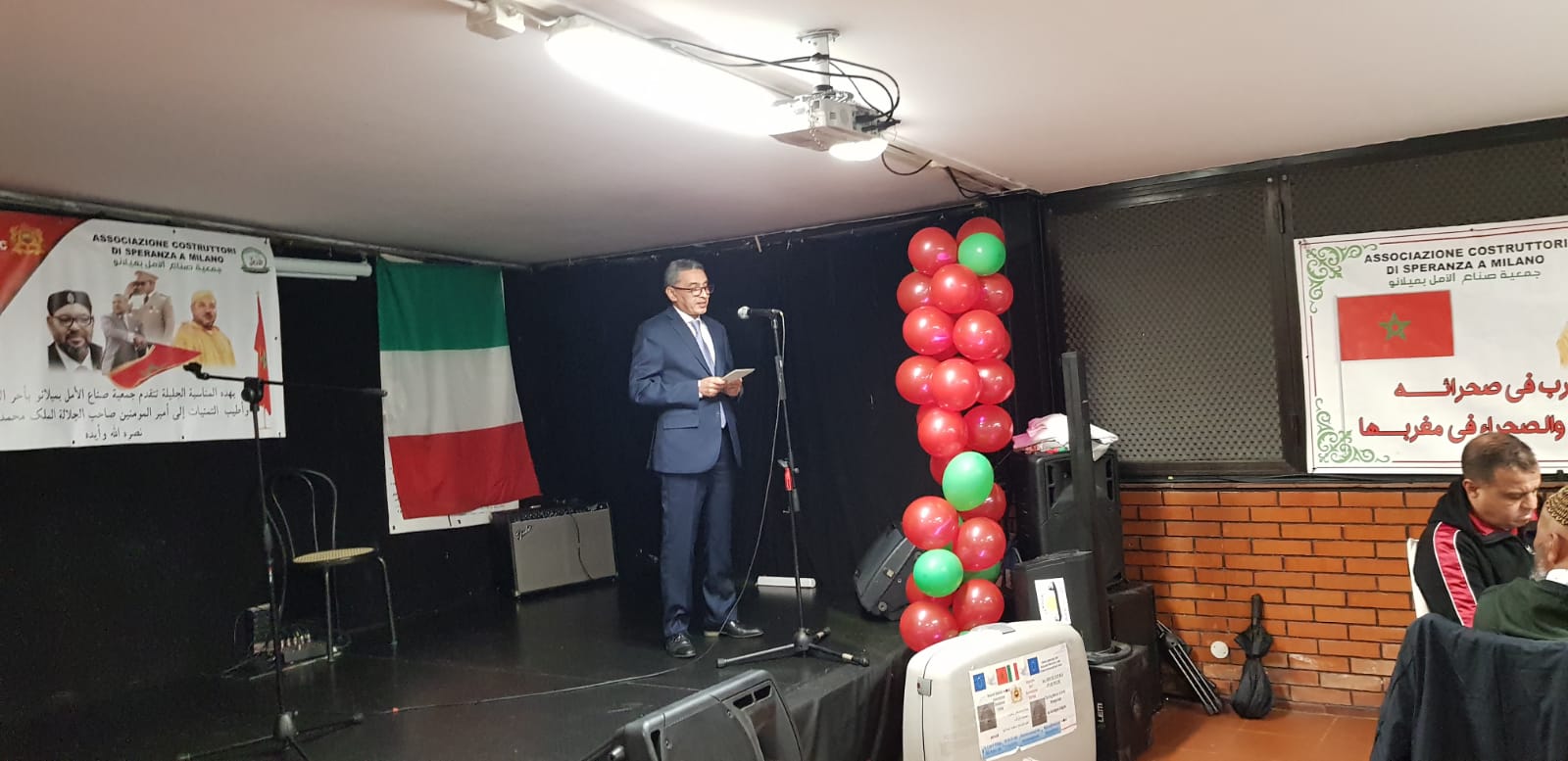 كما أبرز سعادته خلال الكلمة أهمية ودينامية التنمية السوسيو – اقتصادية التي شهدتها الأقاليم الجنوبية بفضل المشاريع والأستثمارات التي تم تنفيذها لفائدة ساكنتها مبينا الأرتباط الوثيق الذي يجمع الأقاليم الجنوبية بالوطن الأم المملكة والتي لا تقبل المزايدة عليها. وقال رشيد راجي رئيس جمعية صناع الأمل بميلانو، بأن هذه الأخيرة دأبت على تنظيم الفعاليات والمناسبات الوطنية التي لقيت صدى طيبا لدى عموم غالبية الجالية المغربية المقيمة بإيطاليا وكذا المتابعين لهذه الفعاليات والمناسبات، وخاصة ذكرى المسيرة الخضراء الخالدة في أذهان المغاربة لما لها من أهمية لدى كل المغاربة، والهدف الأساسي هو لم الشمل في أوساط الجالية وترسيخ الهوية المغربية للمقيمين بايطاليا وارتباطهم بوطنهم الأم.