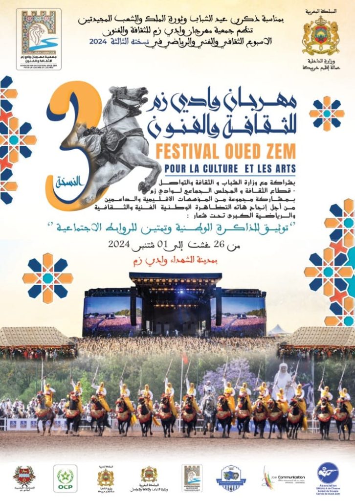 وادي زم – تنظم جمعية مهرجان وادي زم للثقافة والفنون ، الأسبوع الثقافي والفني والرياضي في نسخته الثالثة 2024 تخليدا لذكرى عيد الشباب و ثورة الملك والشعب الغاليتين تحت شعار:”توثيق للذاكرة الوطنية وتمتين للروابط الاجتماعية ” ابتداء من 26غشت إلى01شتنبر 2024 بمدينة وادي زم.