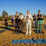 تتقدم لورا وكاتيا، وهما سائحتان ألمانيتان تقيمان بهذا المخيم المطل على التلال الرملية، في هدوء للالتحاق بمجموعة تضم حوالي عشرين من عشاق هذه الممارسة الروحية، قصد الاستمتاع بلحظات من الاسترخاء والهدوء وإعادة الاتصال بالذات.