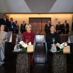وقبل التحاقهن بالمنصة الملكية من أجل متابعة العرض، تقدم للسلام على صاحبات السمو الملكي الأميرات للا خديجة، وللا مريم، وللا حسناء، رئيسة مؤسسة المسرح الملكي الرباط، إلى جانب السيدة بريجيت ماكرون، أعضاء مجلس إدارة المؤسسة.